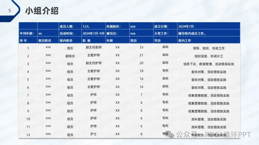 本次改进项目组由12名成员组成,各成员来自不同的科室和岗位,拥有不同的专长和经验。在这个团队中,大家各展所长,紧密合作,致力于共同实现提高肺功能检查操作规范率的目标。团队成员在任务分工上互相补充,在执行过程中相互学习、相互激励,保持高效的沟通和协作,以确保项目的顺利推进。