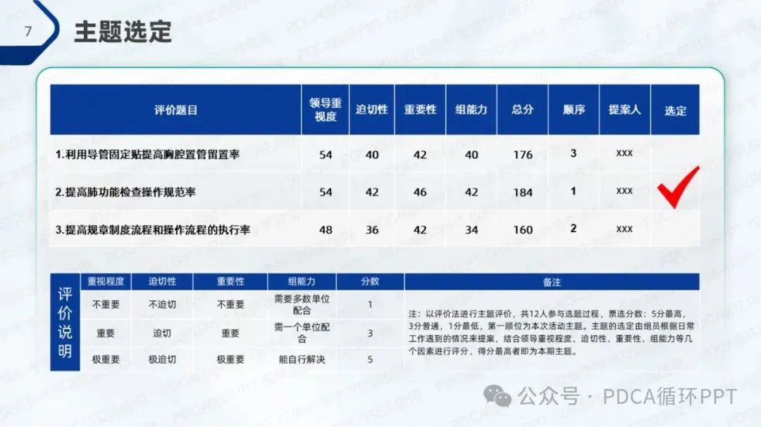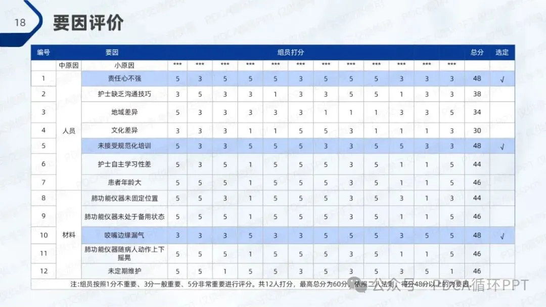 主题的选定由6位组员参与,采用评价法进行评分。每位成员根据自己在日常工作中遇到的问题和挑战进行提案,并结合四大因素对选题进行评估。经过投票,肺功能检查操作规范率的提升获得了最高分,成为本期项目的重点改进主题。