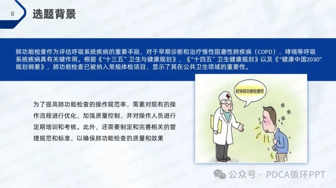 肺功能检查是评估呼吸系统健康的重要手段,它在诊断慢性阻塞性肺疾病(COPD)、哮喘等常见呼吸疾病中起着至关重要的作用。随着健康管理的不断推进,肺功能检查逐渐成为常规体检项目的重要组成部分。为了确保患者能够得到准确、科学的评估,规范化的操作流程显得尤为重要。然而,实际操作中仍存在一定程度的操作不规范现象,影响了检查结果的准确性和可靠性。因此,提升肺功能检查的操作规范率,优化操作流程,强化人员培训和管理,成为当前改进工作的关键目标。
