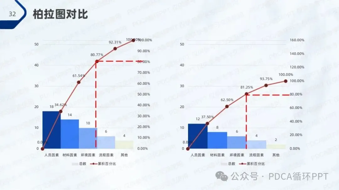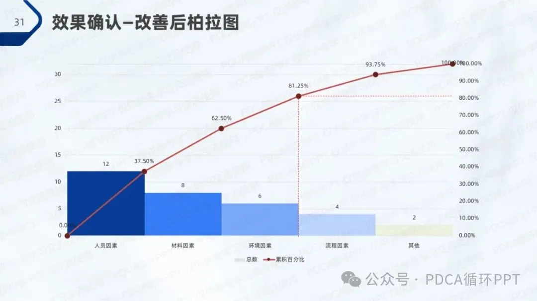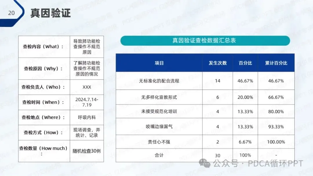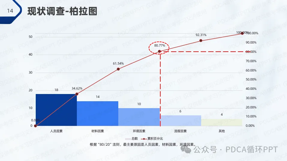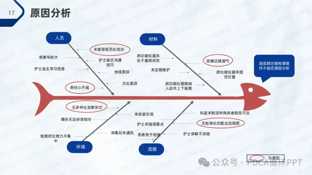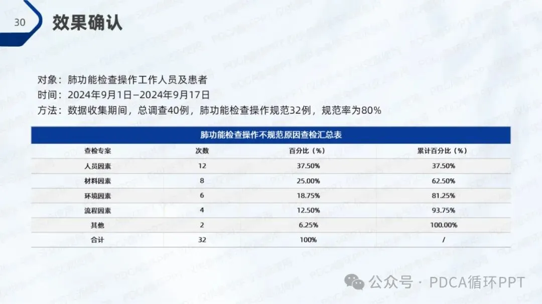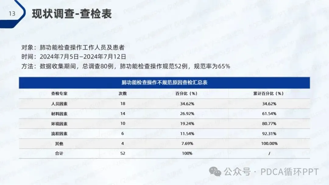 在本次调查中,针对80例肺功能检查样本,结果显示有52例符合操作规范,规范率为65%。从调查数据中可以看出,操作不规范的主要原因集中在人员因素、材料因素和环境因素,符合“80/20”法则,即少数原因导致了大部分问题。因此,优化操作规范的关键在于这几个方面的改进。