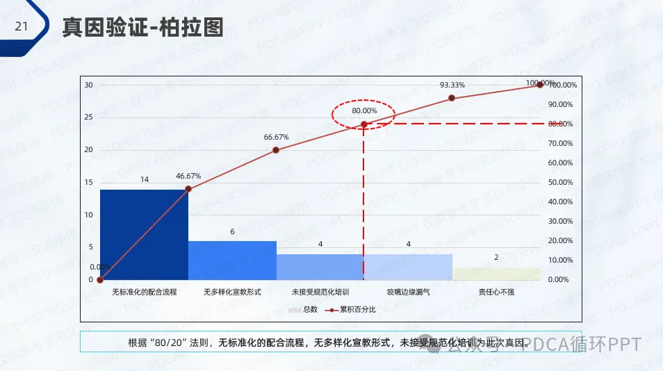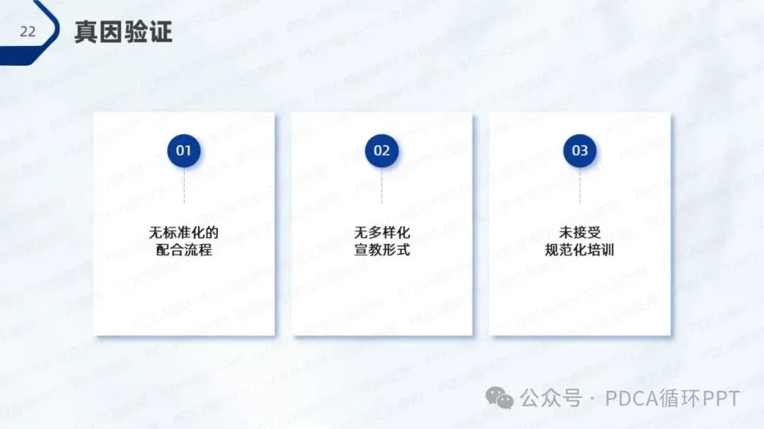 通过柏拉图对数据进行进一步分析,验证了操作不规范的主要原因,进一步确定了真因:标准化操作流程缺乏、多样化的宣教形式未广泛应用以及未进行规范化培训。