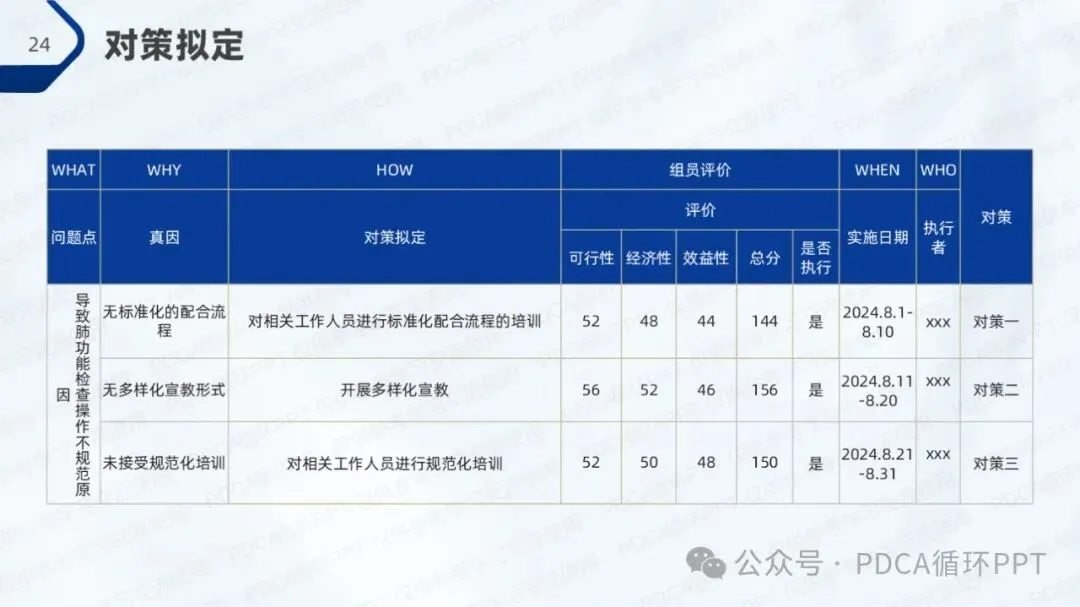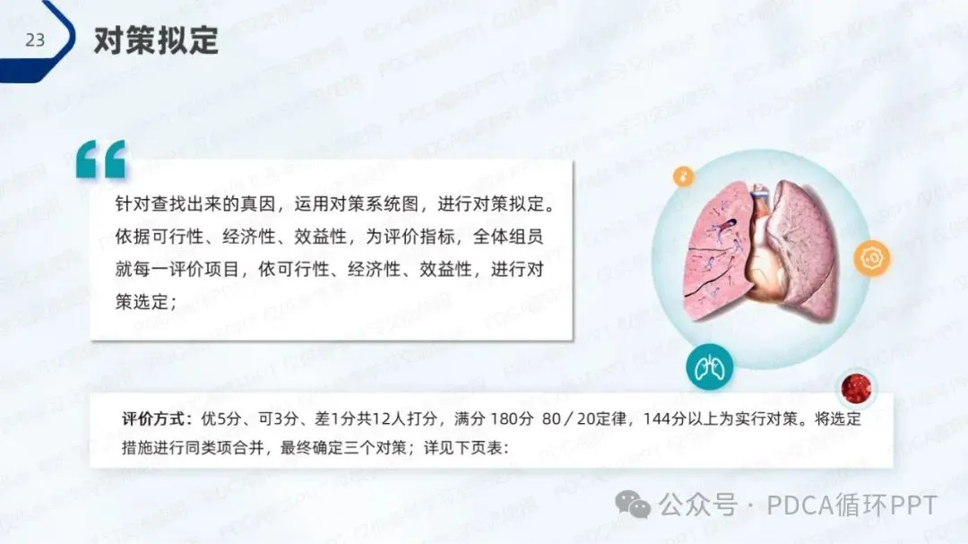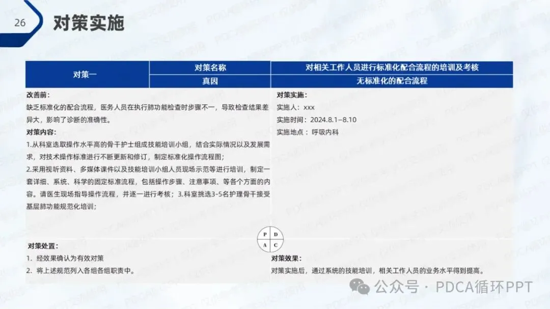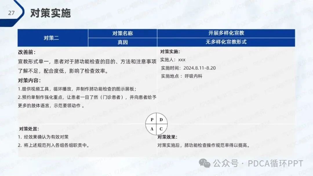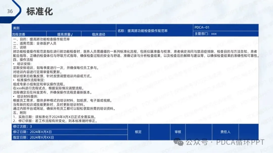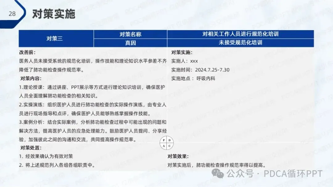 结合现有的规范率和改善目标,我们计划通过改进措施将肺功能检查操作规范率提升至80%。为了实现这一目标,团队将聚焦在人员培训、流程优化和设备支持等方面,通过系统化的提升来改善操作质量。