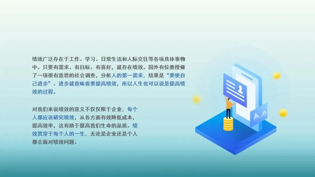 对我们来说绩效的意义不仅仅限于企业,每个人都应该研究绩效,从各方面有效降低成本,提高效率,这有助于提高我们生命的品质。绩效贯穿于每个人的一生,无论是企业还是个人都会面对绩效问题。