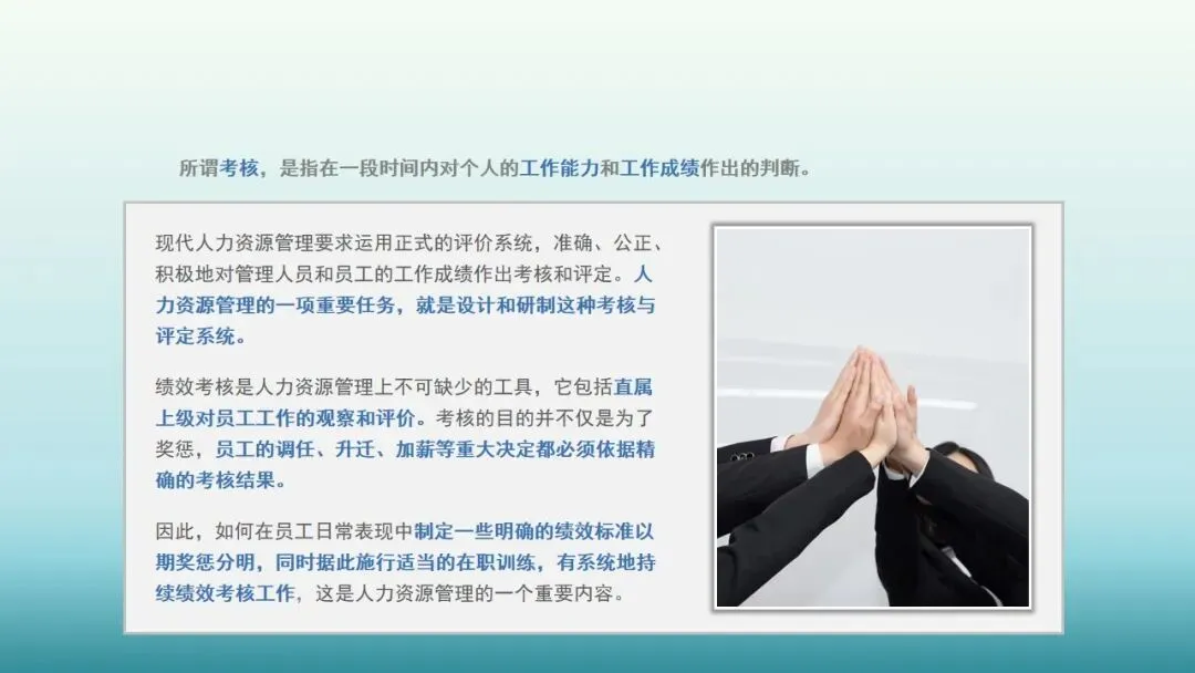 现代人力资源管理要求运用正式的评价系统,准确、公正、积极地对管理人员和员工的工作成绩作出考核和评定。人力资源管理的一项重要任务,就是设计和研制这种考核与评定系统。