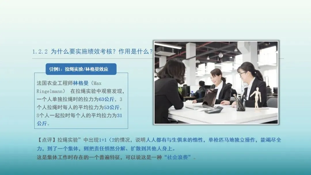 法国农业工程师林格曼(Max Ringelmann) 在拉绳实验中观察发现,一个人单独拉绳时的拉力为63公斤,3个人拉绳时每人的平均拉力为53公斤,8个人一起拉时每个人的平均拉力为31公斤。