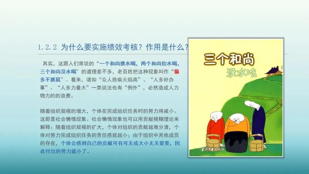 其实,这跟人们常说的“一个和尚挑水喝,两个和尚抬水喝,三个和尚没水喝”的道理差不多,老百姓把这种现象叫作“猫多不抓鼠”。看来,诸如“众人拾柴火焰高”、“人多好办事”、“人多力量大”一类说法也有“例外”,必然造成人力物力的的浪费。