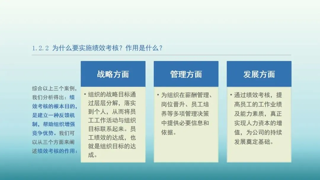 合以上三个案例,我们分析得出:绩效考核的根本目的,是建立一种反馈机制,帮助组织增强竞争优势。我们可以从三个方面来阐述绩效考核的作用: