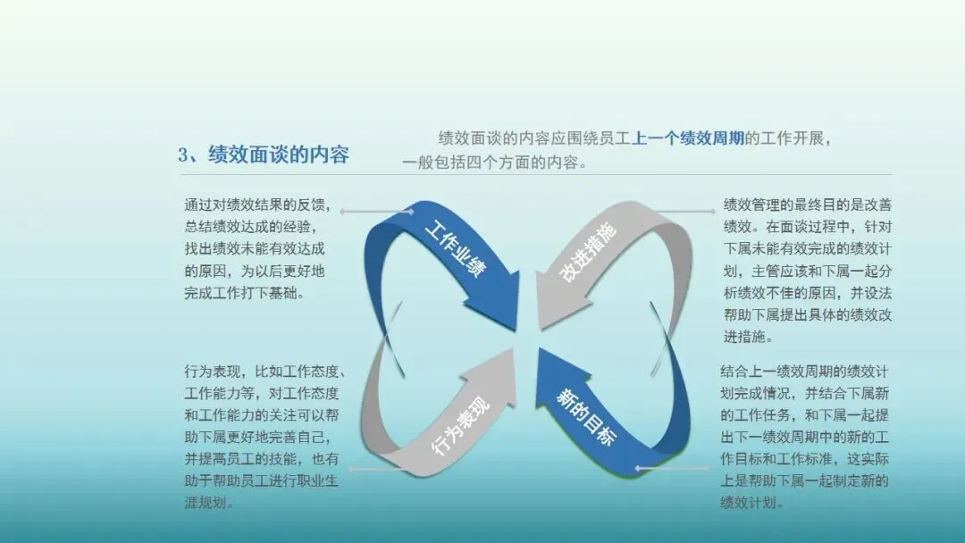 谈绩效的目的就在于使我们充分了解过去,同时认识现在,并在此基础上更好地规划未来。当然,我们谈绩效也会谈到关于薪酬、晋升、激励的问题,但绩效的核心还是在于改进。