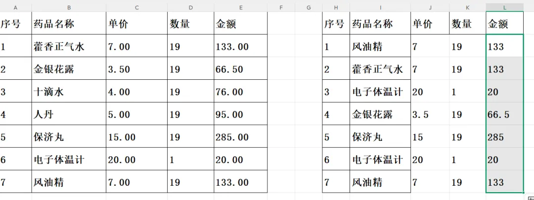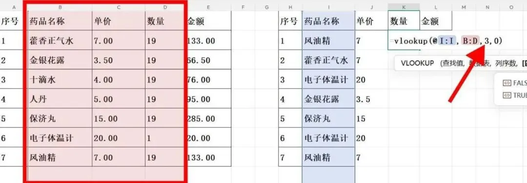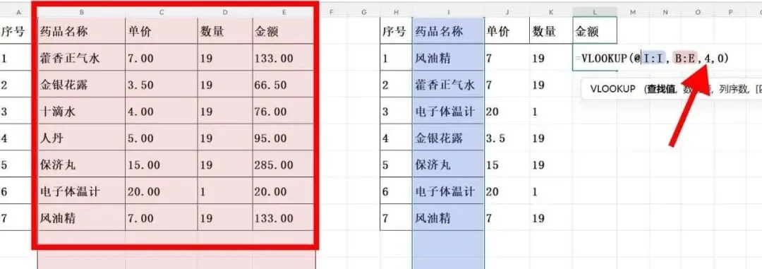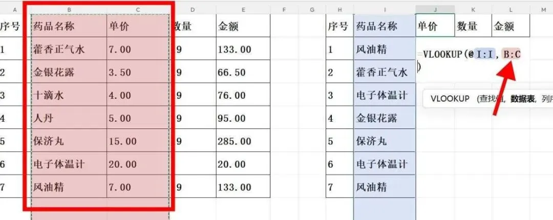 要想在excel表格中,找到另一表格里对应的数据,不要只会一个个地找,一个个地复制粘贴,学会用vlookup函数,就可快速提取到任何你想到的数据,而且还十分精准。二、这是我们要填的表,但是“药品名称”这一列是乱序的,与图一的原始表顺序不一致。三、现在我们要填“单价”这一列数据,在“单价”列输入vlookup函数,点击药品名称所在的I列。(注:我现在用的这个excel版本要在选中I列前,输入@符号,其实大部分版本是不用输入@的。)四、接着选中原始表中“药品名称”和“单价”BC这两列数据。五、在函数中输入2和0,2表示提取的是所选原始表“药品名称”和“单价”BC这两列中的第2列数据,要提取的是“单价”信息。八、同样,要填“数量”信息的话,也是用一样的方法,只是函数中的2变成3,表示提取所选原始表中第3列“数量”数据。九、同样,要填“金额”信息的话,也是用一样的方法,只是函数中的2变成4,表示提取所选原始表中第4列“金额”数据。十、至此,我们要填的这份新表,就完成了所有的信息抓取。这个函数应该是财务工作中最经常用到的函数之一,除了能快速匹配到相应的数据,平时,我还经常用它来核对信息,比如,对碰两列数据,看有无多余或缺漏的数据。