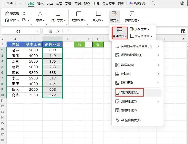第一步:首先选择数据区域C2:C10,然后点击【开始】-【条件格式】-【新建规则】调出新建格式规则”对话框