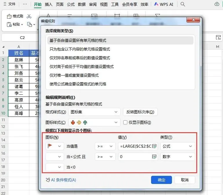 ①如果单元格中的数值大于等于LARGE函数的计算结果,单元格中显示红色旗帜图标。