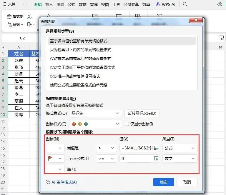 ②如果单元格中的数值小于等于SMALL函数的计算结果并且大于等于0,单元格中显示红色旗帜图标。