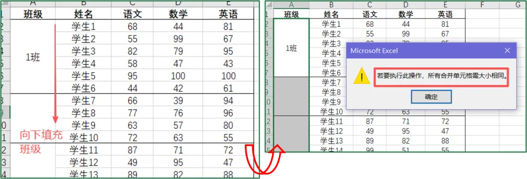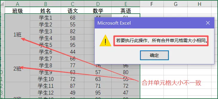 当“合并单元格”大小不一致,即每一处合并的数量不一致时,排序时会报错“若要执行此操作,所有合并单元格需大小相同”。