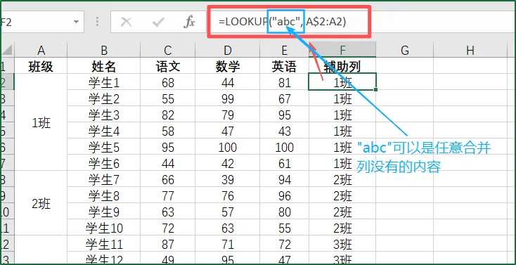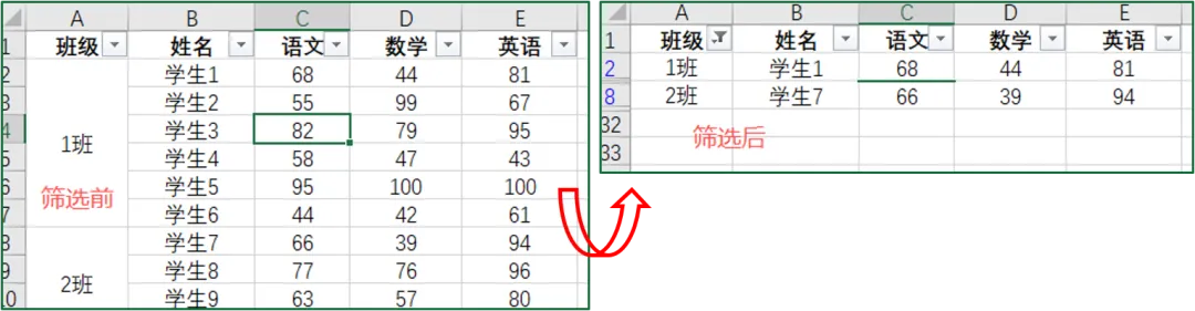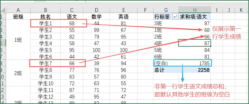 与筛选情况类似,仅汇总第一行学生成绩,非第一行学生的班级默认为空白。