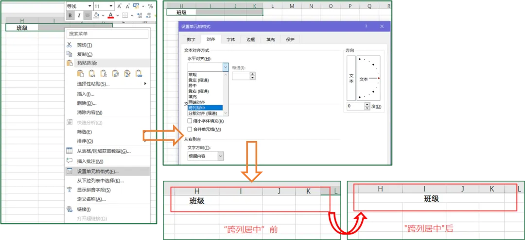 ①跨列居中:即多列共用一个标题时,使用“跨列居中”格式,视觉效果上是“合并”,实际并未合并,操作步骤【选中多列-右击-设置单元格格式-对齐-水平对齐-跨列居中】。