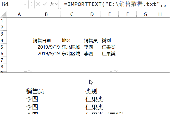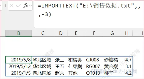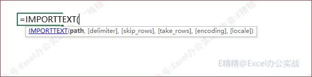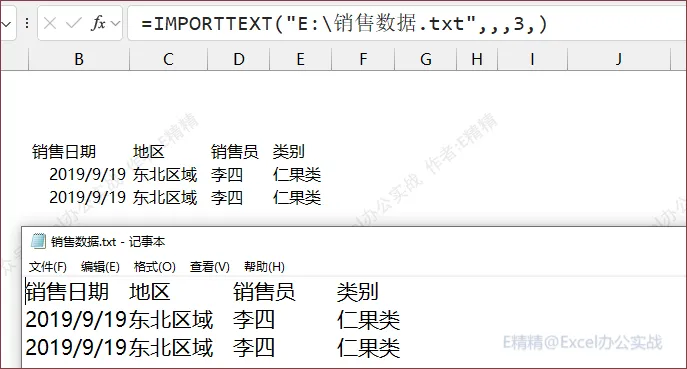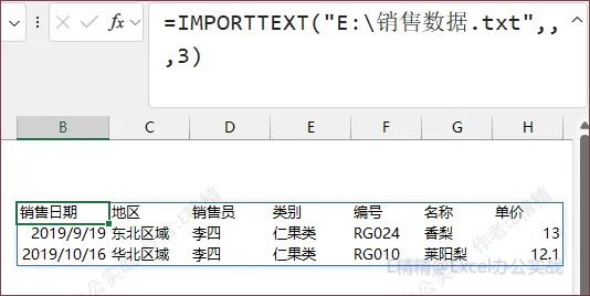 在微软最近的更新中,Excel新增了两个函数(IMPORTTEXT和IMPORTCSV),这两个函数主要解决跨文件数据导入问题,年终了大家可以用起来了!目前新增的这两个函数,主要针对文本文件的数据导入到Excel中的问题!在最新的Excel365中,输入=IMPORT,即可看到下面两个函数,一个是辅助把CSV格式,一个是负责把TXT格式的文件数据导入到Excel中,他们两个本质都是文本文件格式!他们的函数参数基本一致,我们就拿常见的TXT文本来讲解吧!核心参数,Path:文件全路径或者网络中的URL,如果获取全部数据,设置这个参数即可,下面我们还是通过实战来辅助讲解吧!准备一个记事本文件,其中放入数据,一般都是逗号间隔,当然也可以是空格,比如直接复制Excel数据粘贴进来默认就是空格,都是OK的!下面请看动画演示!路径修改为自己的文件路径进行测试!=IMPORTTEXT("E:\销售数据.txt")