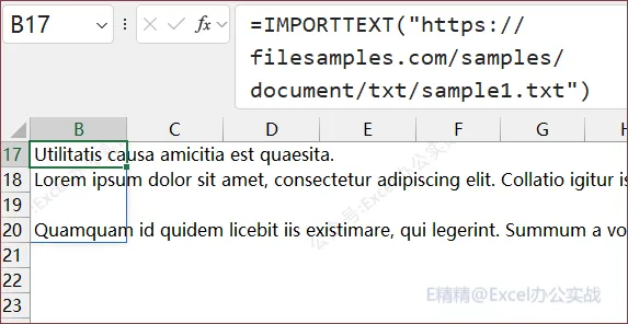 从动画演示可以看出两点,第一,导入外部数据,有会一个风险提示,这个是正常的,其实数据导入,是要经过云端的(BUSY加载中),不是本地导入!我们也可以直接从网络中加载TXT文件,比如下面这个!=IMPORTTEXT("https://filesamples.com/samples/document/txt/sample1.txt")