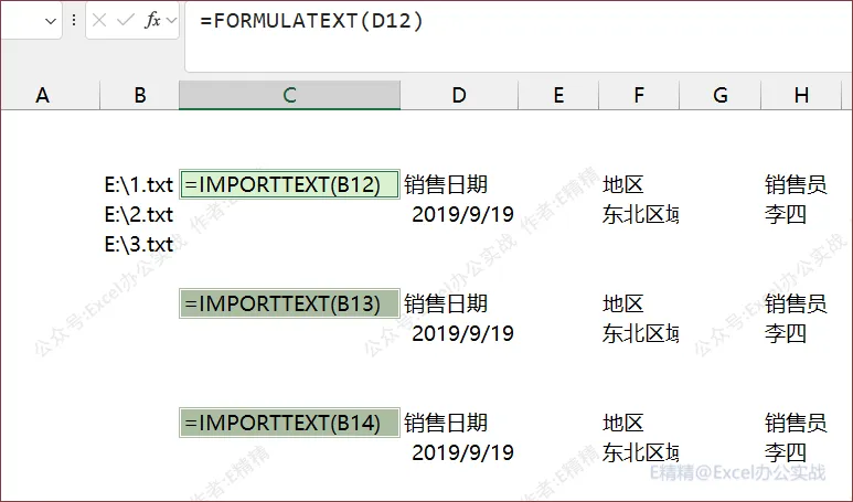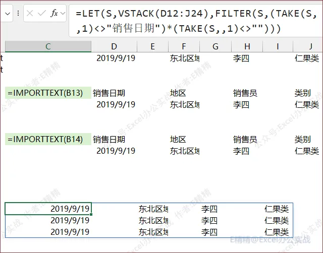 第二、三参数就是导入时可以跳过行和获取行,一般针对文件前面有一些不需要的内容(比如空行等),主要这两个参数都支持正负数!跟工作表函数DROP和TAKE差不多,正数开头,负数结尾处理!比如下面这样,第三参数使用3,就是获取前3行数据!编码参数目前测试还是无法设置其他编码,官方文档也无其他编码示例说明,暂时大家保存时还是都选择UTF-8编码吧!最后一个参数,默认调用的是本地电脑的地区设置,一般不用管!讲了半天,感觉也没什么用?你是不是感觉,好像我粘贴数据也是一样的!其实他最大的好处就是固定链接刷新,比如我们更新了数据,只要数据路径没改,刷新即可!注意:这个函数,修改数据源后,普通的F9和Shift+F9都无法更新数据,需要使用【数据】- 【全部刷新】或者添加修改参数(比如修改获取数据行数参数)才可以!我们修改数据源后,普通进入公式重新回车,F9,重算等方法都无法实现重新加入刷新数据,目前测试,修改参数比如获取行数参数会重新加载其实,是不是有同学会想到多文件数据合并,借助Excel365中的VSTACK等函数,但是下面这样是不支持的虽然不支持,但是也不知毫无办法,如果文件较少,只是更新频繁,可以下面这样,先在不同工作表或者区域中分别加载数据,然后使用VSTACK合并!二次合并,筛选数据,一般就是去掉空行和标题,当然在函数中你就可以去掉标题行,直接去掉多的空白行即可!后面数据更新记得全部刷新即可!这对不会VBA、PQ等自动化工具的普通办公新手也不失为一种不错的方法!今天的内容就到这里,新函数更多玩法有待进一步挖掘!
