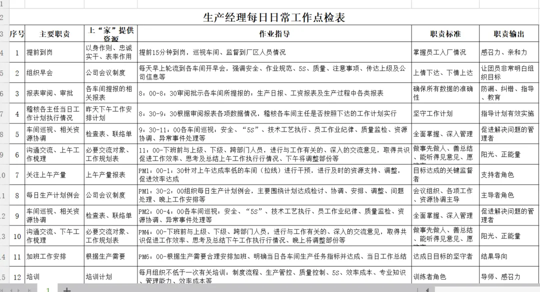 | | | PM6:00-根据生产需要合理安排加班、明确当日各车间生产任务指标并达成、当日工作总结 | | |