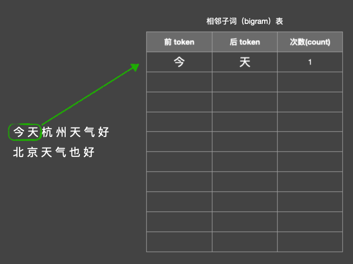 "今", "天", "气", "好", "也", "杭", "州", "北", "京"2、统计词表中 token 的出现的次数:
