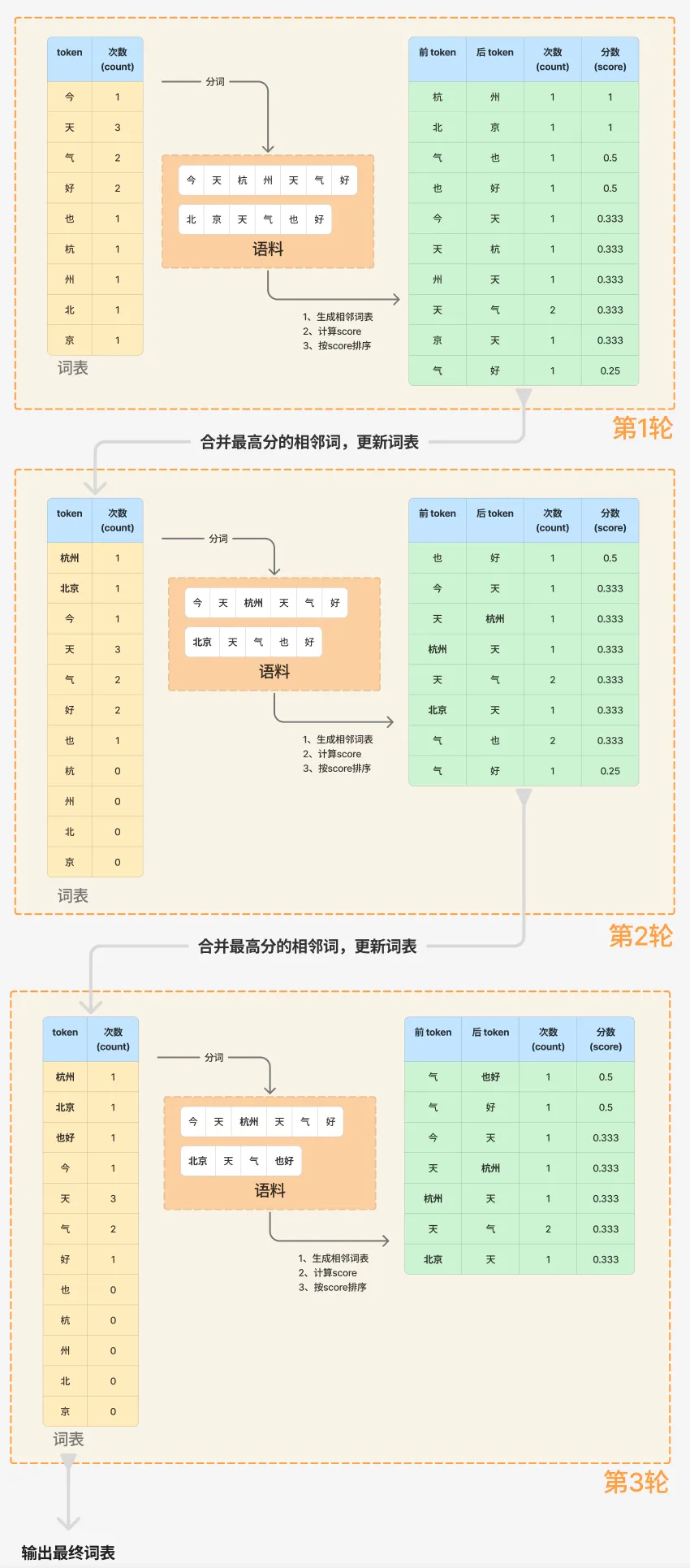 💡 这里需要注意的是合并后的“杭州” 加入词表后,原来的“杭”,“州”是不删除的。词表在训练过程中是只会增大的,也就是初始化的词表一定是最终词表的一个子集。