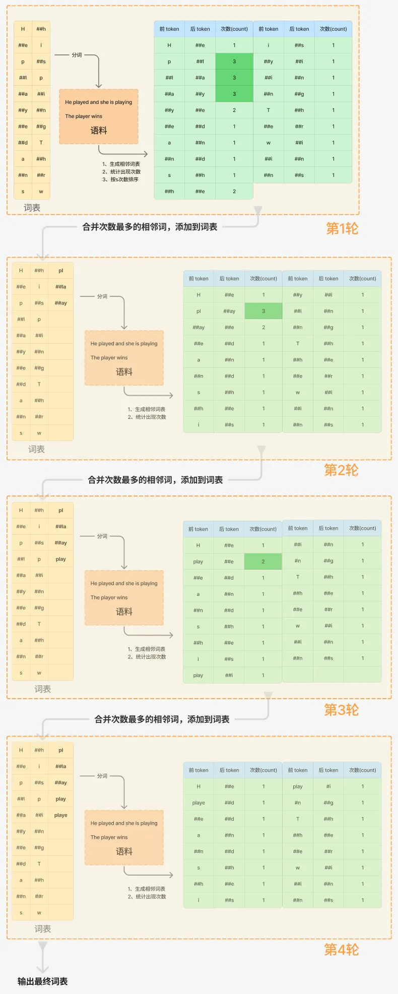"p" + "##l" → "pl""##l" + "##a" → "##la""##a" + "##y" → "##ay"把新合并的词加入原词表,并重新统计后再词执行合并。