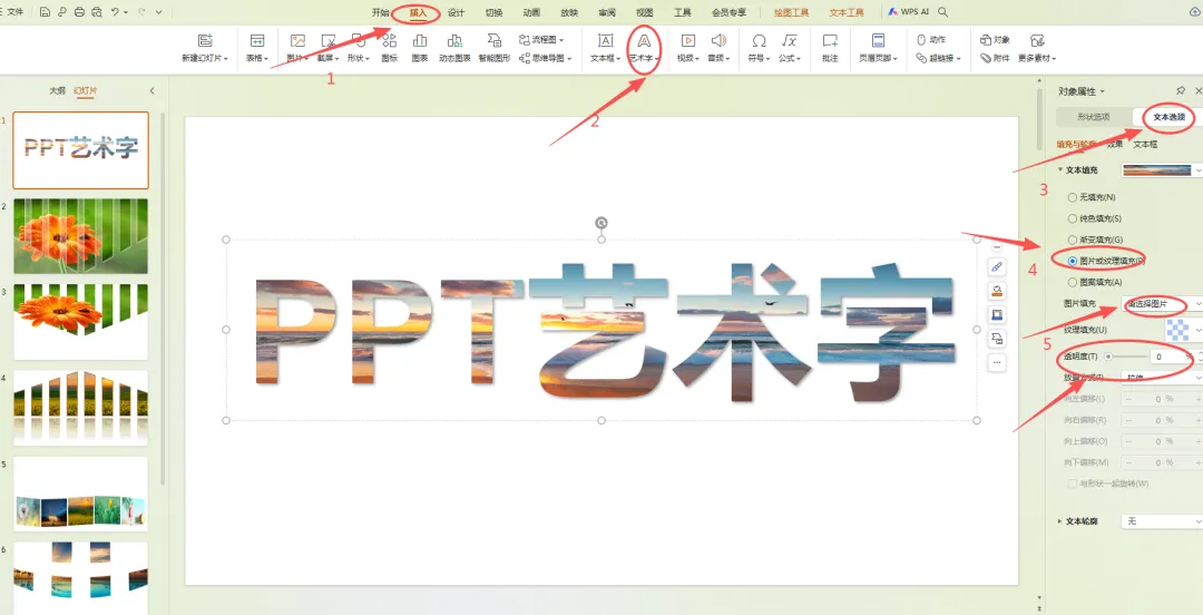 下图除了添加艺术字,还给艺术字添加了图片打底,想要下图的效果,就继续点击图片右框3处的文本选项,4填充处选择图片,再根据自己需求选择图片和图片参数调整。