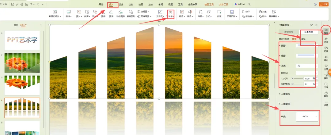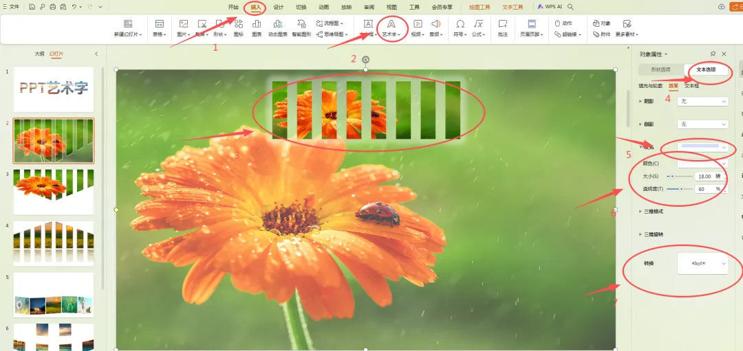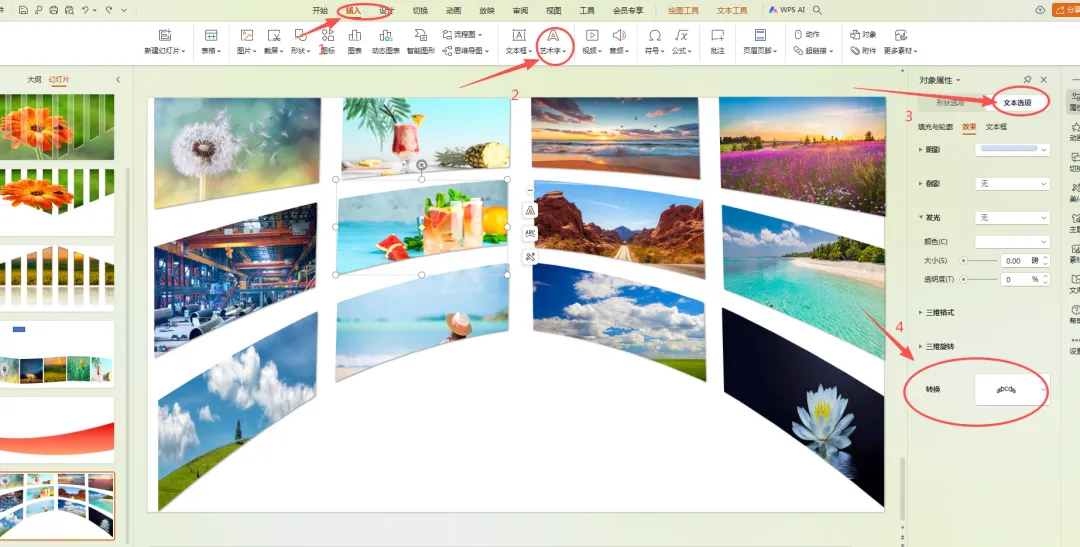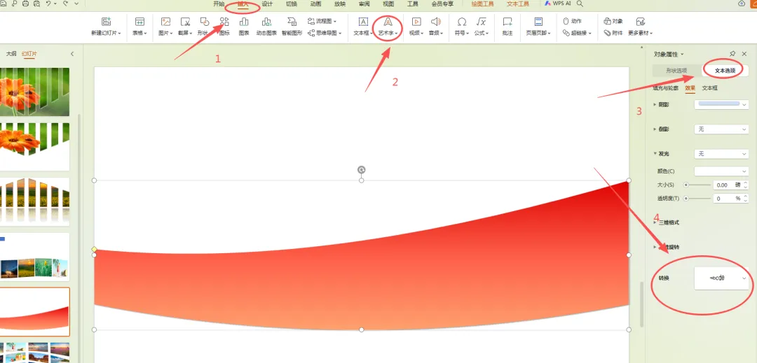 下图这个可以用在文中页装饰,这个也是前面先插入艺术字,然后这个字就是“一”,然后填充我选的渐变红色填充的,这里需要注意的是如图3处文本选项这里选择效果,然后4处这里点开,有很多三维转换的效果,我选择的是圈中这个效果,所以就得到下图了。这是艺术字不同的排列和变形的三维转换选项,可以根据需求选择。