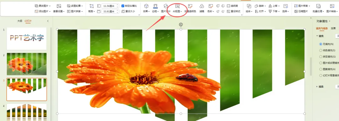 再看下图这个,也可以把图中的花朵先用PPT带的AI抠图,抠出来,然后再调整大小放到原图片的位置,这样的花朵更立体。