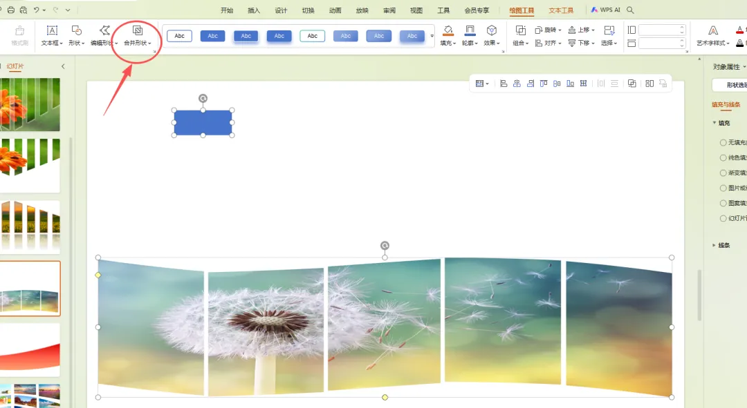 再根据上述插入矩形,同时选择后合并形状里的拆分。再根据需要点击每个形状添加想要的照片。就可以有个不一样的照片展示的PPT页面了。