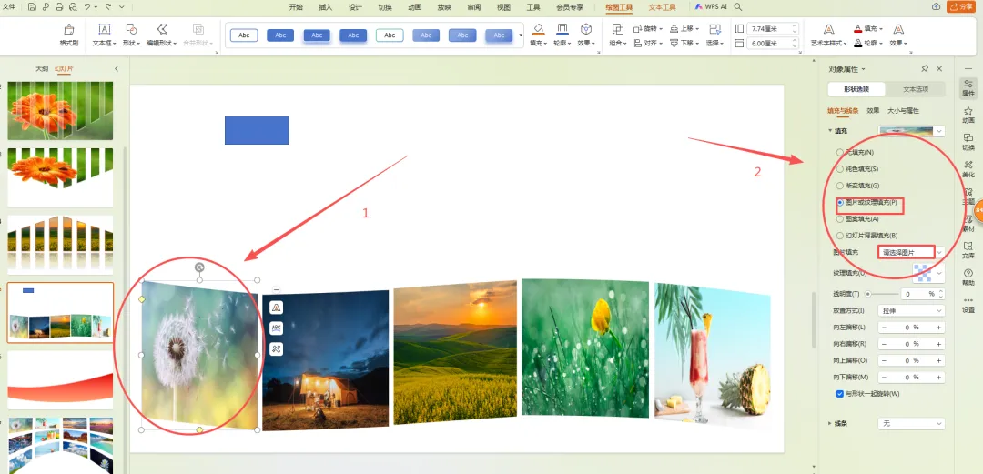 然后根据自己需求再调整这些图形的大小位置,可以添加不同的图片,如下图,先1选中图片再2根据需求添加图片。