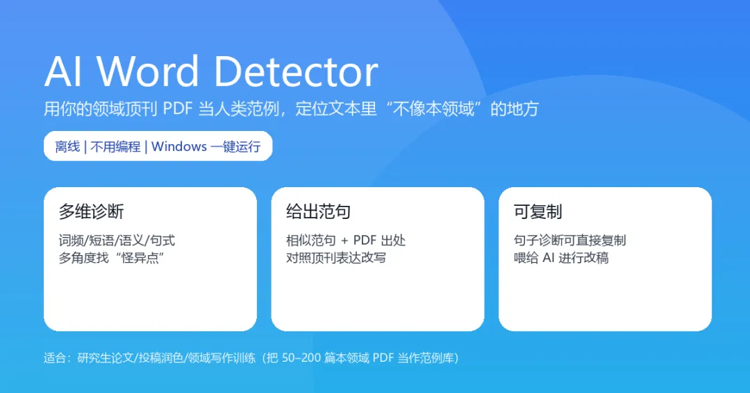 说明:AI Word Detector 的目标是提升学术表达与领域一致性。如果你在学校/期刊场景使用 AI 辅助润色,请遵守相应的披露与规范要求。