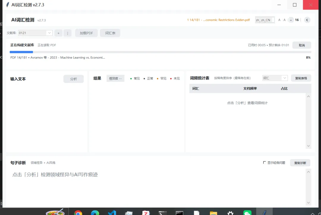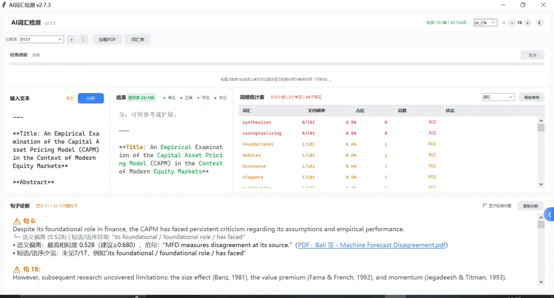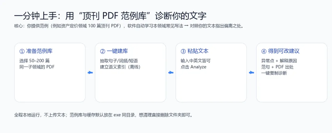 你提供一个“规范文档库”当人类范例(比如资产定价领域 100 篇顶刊 PDF),软件会自动学习这个领域的常见写法,然后对照你输入的文本,标出哪些词/句子/表达更像“领域外写法”,并解释原因,还会给出可参考的范句(带 PDF 出处)。