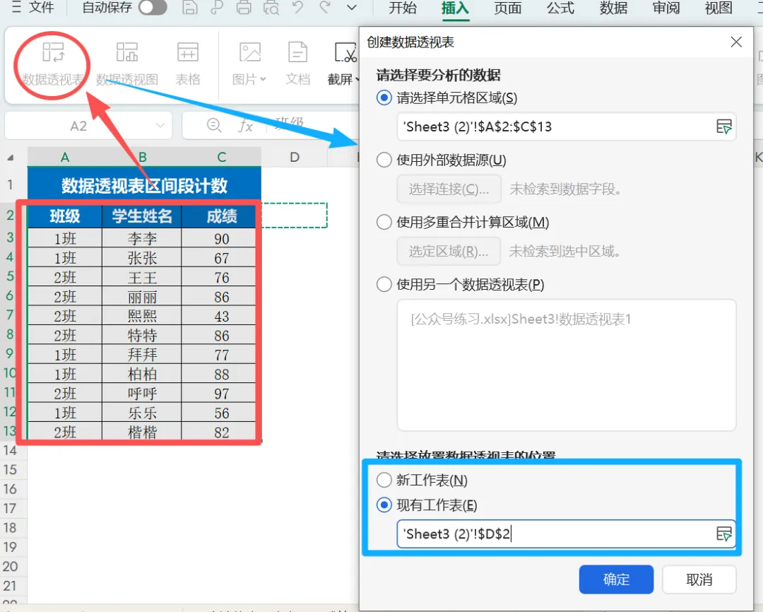 ① 选中全部原始数据(含表头:班级、姓名、成绩),确保数据区域连续(无空行空列);