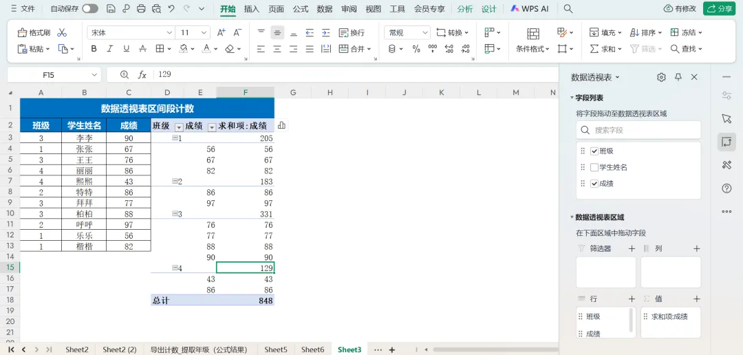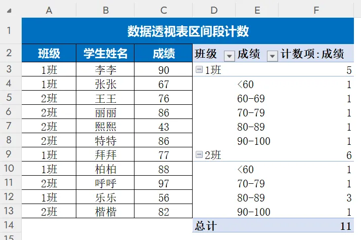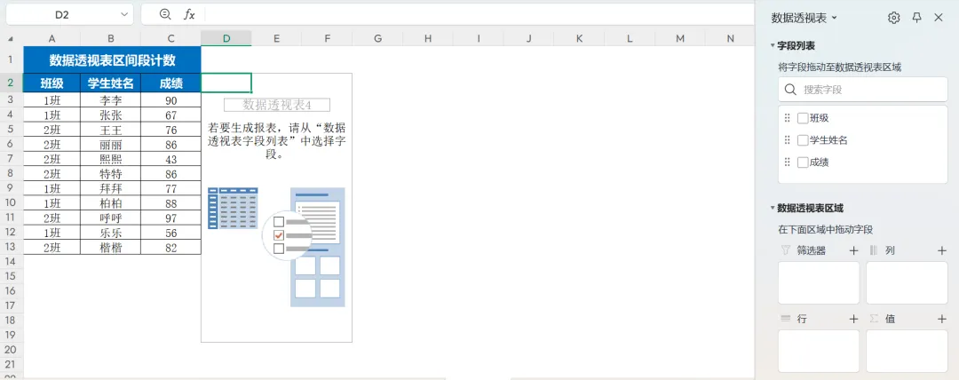 【成绩】→ 拖到【行】区域(放在【班级】下方,行标签:按成绩区间分组);