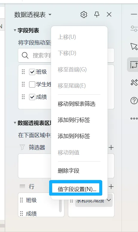 右键点击「值」区域的 “求和项:成绩”→ 选择「值字段设置」;