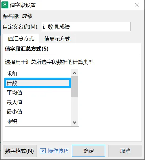 弹出对话框,在「汇总方式」中选择「计数」→ 点击「确定」;