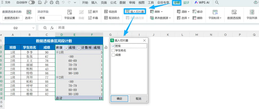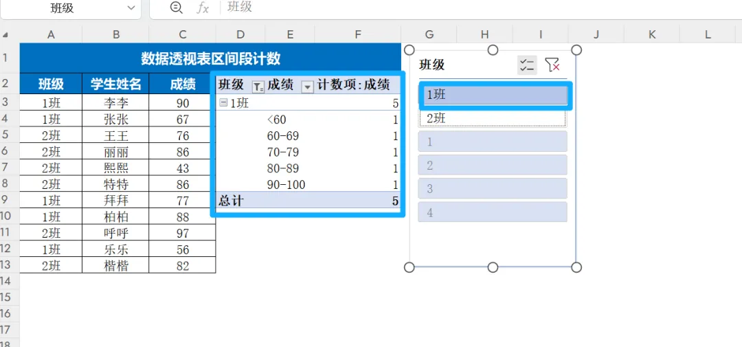 ③ 生成【班级】切片器:点击 “1班”,透视表自动只显示1班的成绩区间统计;点击 “清除筛选器” 可恢复全部数据