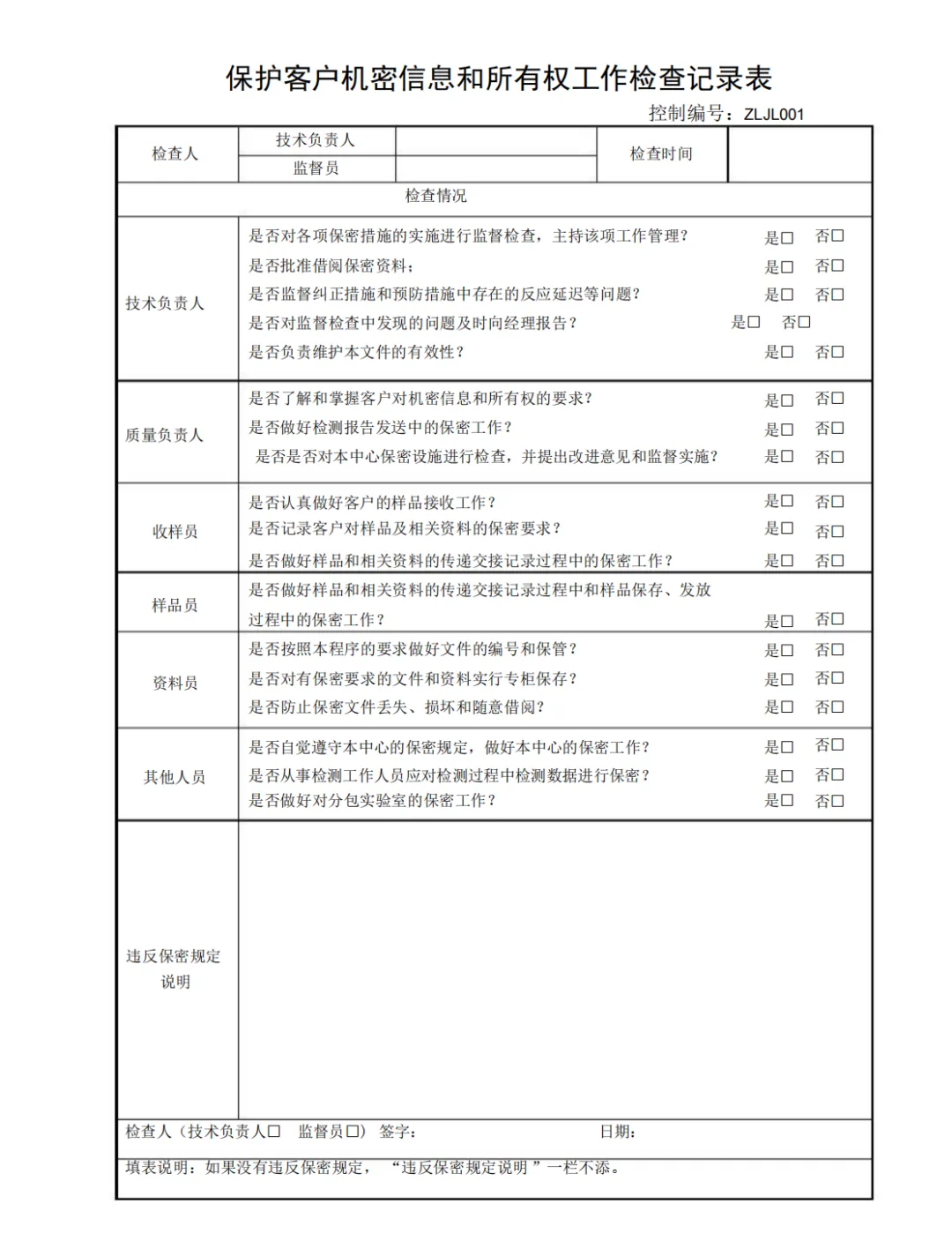保护客户机密信息和所有权工作检查记录表