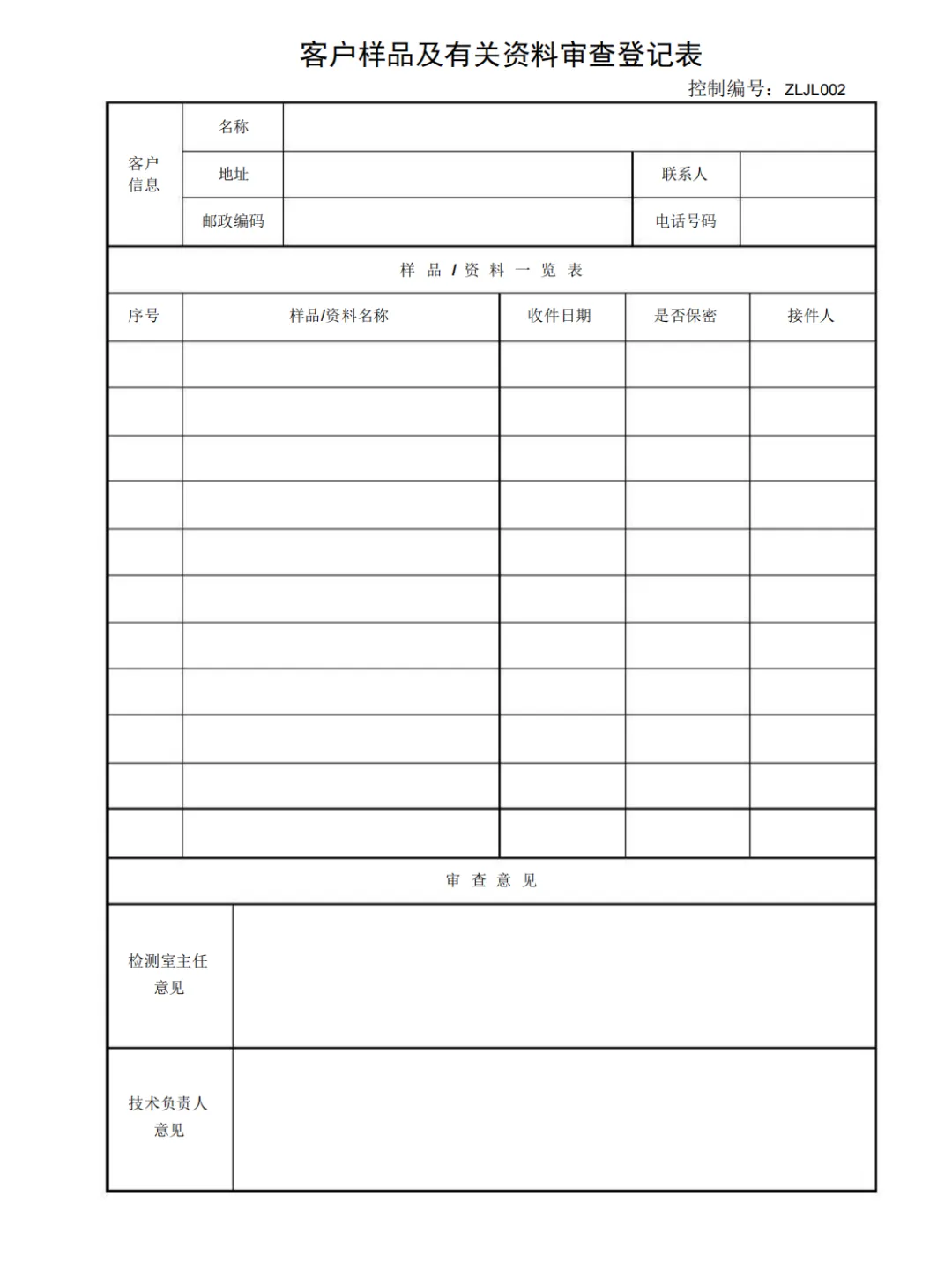客户样品及有关资料审查登记表