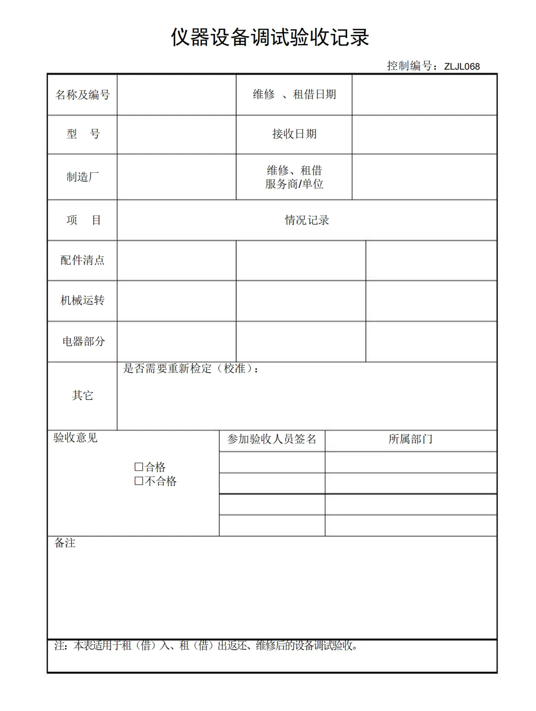 仪器设备调试验收记录