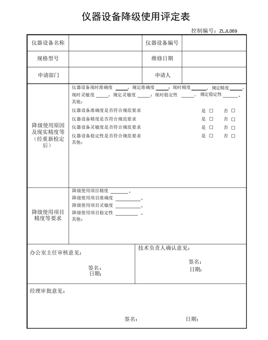 仪器设备降级使用评定表