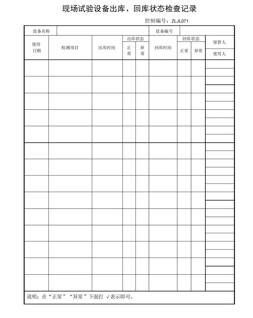 现场试验设备出库、回库状态检查记录