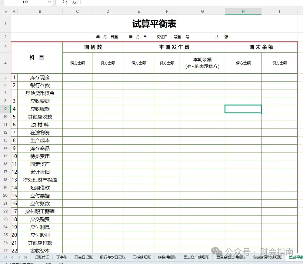 财务手工账Excel模板!全套手工账电子表格模板:记账凭证模板、丁字账模板、试算平衡表、现金日记账明细表模板……等,打印直接用