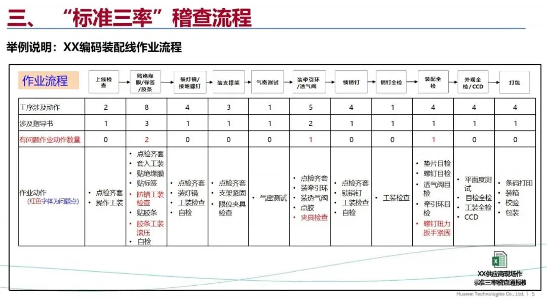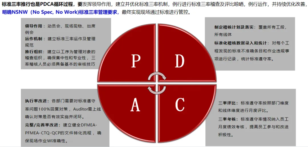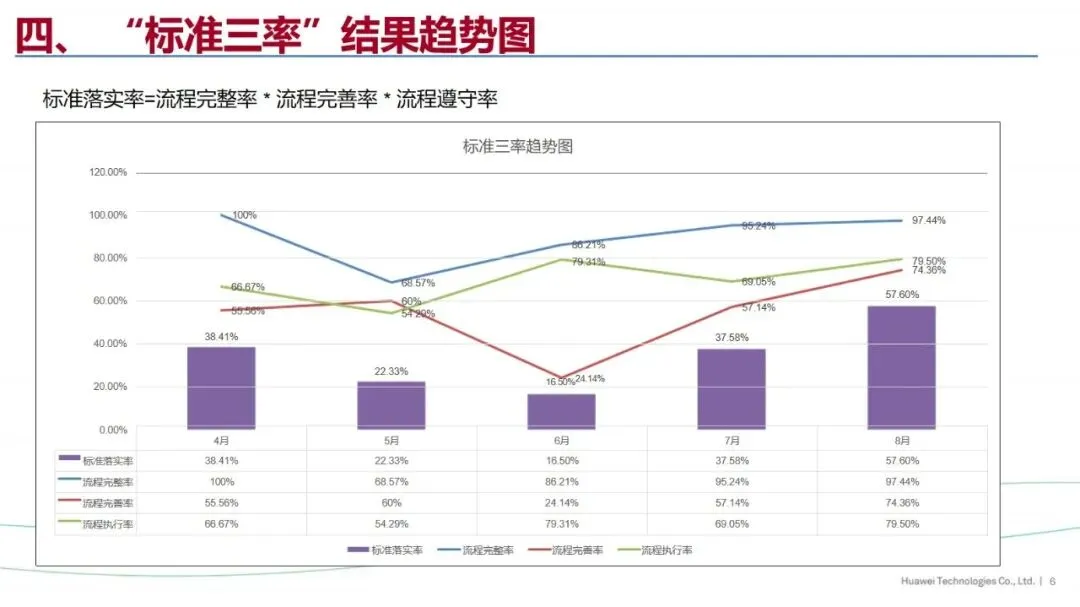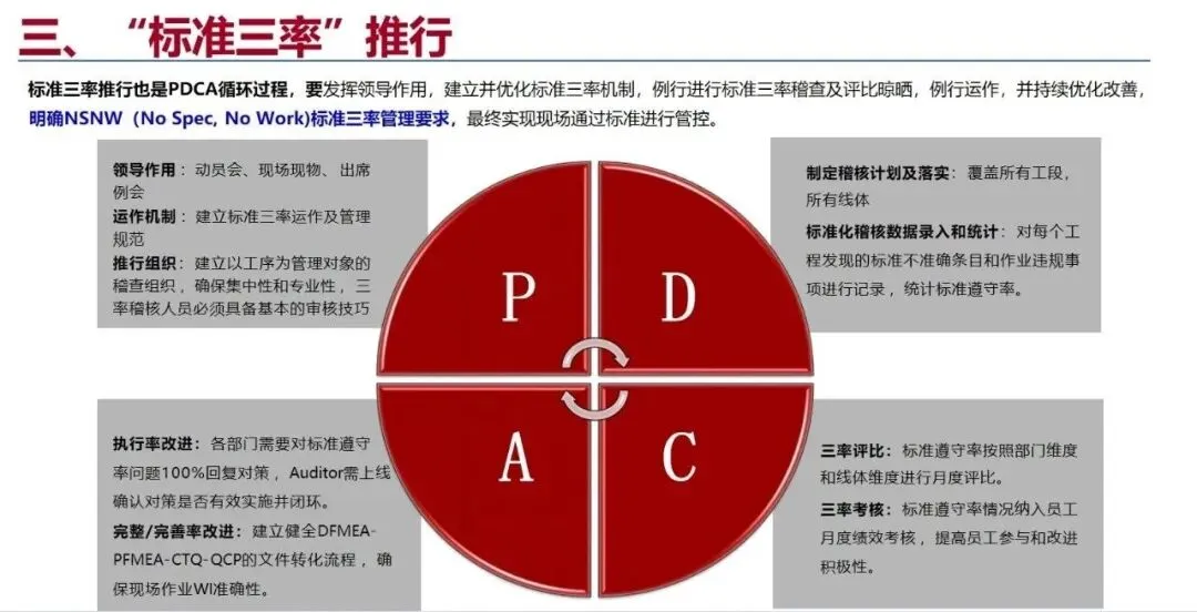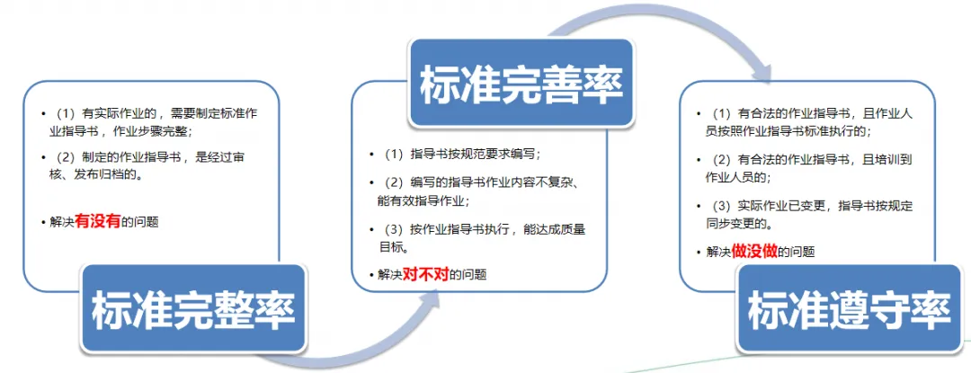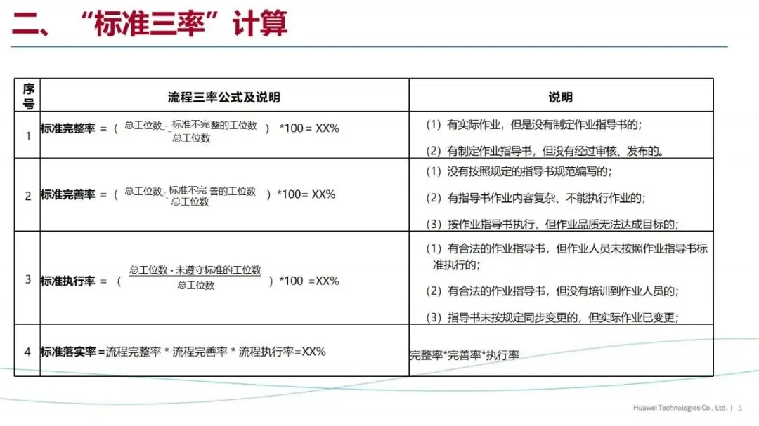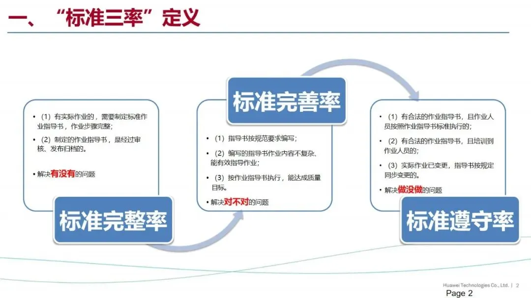 “标准三率”是华为针对生产现场的质量管理提出的一项重要措施,其核心是标准的完整率、完善率和遵守率,以“有没有”、“对不对”、“做没做”为核心,实施闭环管理,实现生产现场的全过程标准化控制。