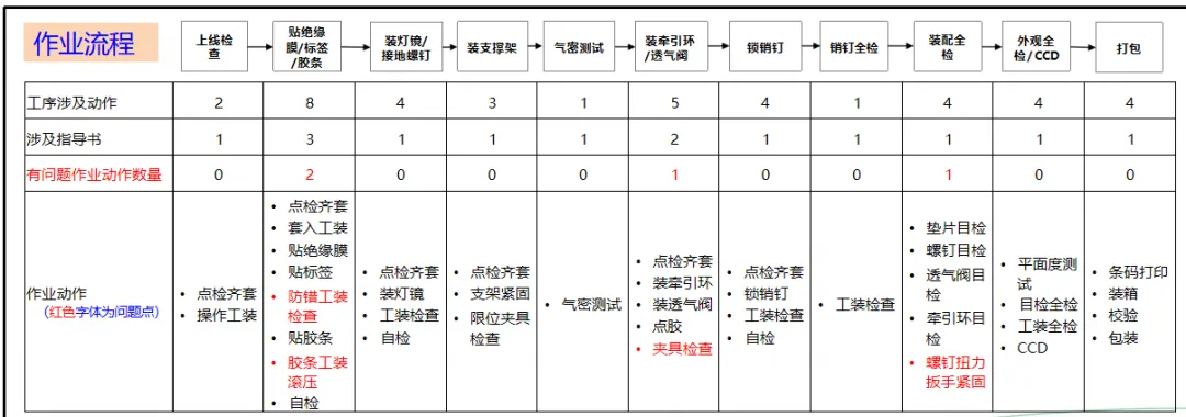 检查环节,侧重于操作层面的落地,比如XX流水线,每一道工序都会统计操作动作的数量,对应的作业指导书的数量,以及诸如贴胶带,装牵引环之类的问题动作,精确找出作业指导书与实际操作之间的差距。从实施4~8个月的数据看,标准执行率由38.41%提高到57.60%,工序完整率在后期达到97%,完善率和遵守率也在不断提高,生产现场的质量管理规范化程度显著提高,验证了实施“标准三率”的效果。