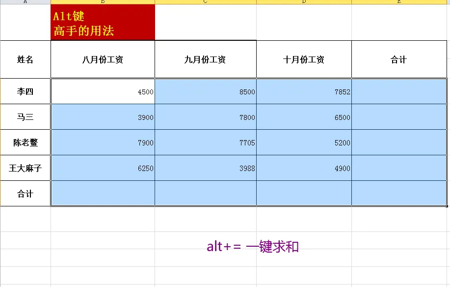 选中数据,Alt+= 一键求和