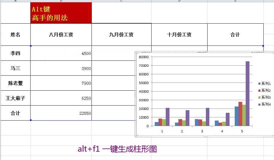 选中数据,alt+f1 一键生柱形图