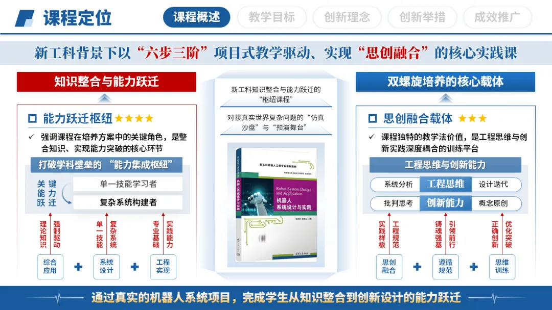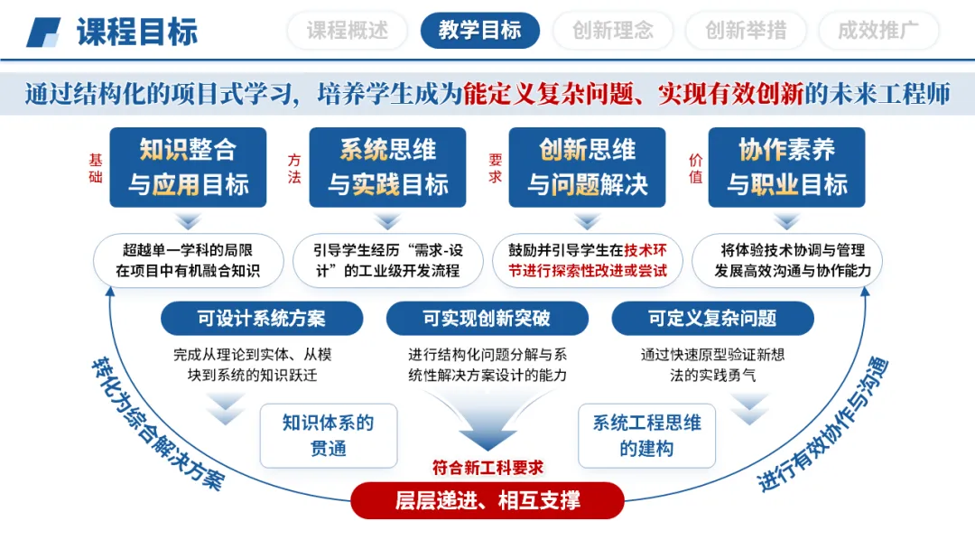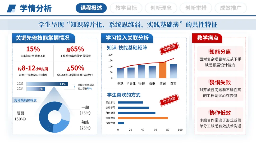 这份 PPT 的核心亮点在于构建了闭环且完整的逻辑框架,以 “教学目标 - 课程概述 - 创新理念 - 创新举措 - 成效推广” 为主线,每个板块既重点突出又相互呼应,让评委能快速把握教学创新的整体脉络。开篇并未急于展示成果,而是先直击学生 “知识碎片化、系统思维弱、实践基础薄” 的学情痛点,用先修技能掌握率不足 15%、超 65% 学生工程系统集成能力薄弱等精准数据佐证问题,再通过对比表格、占比图表等可视化形式,直观呈现教学改进的必要性,让创新举措的提出更具说服力。