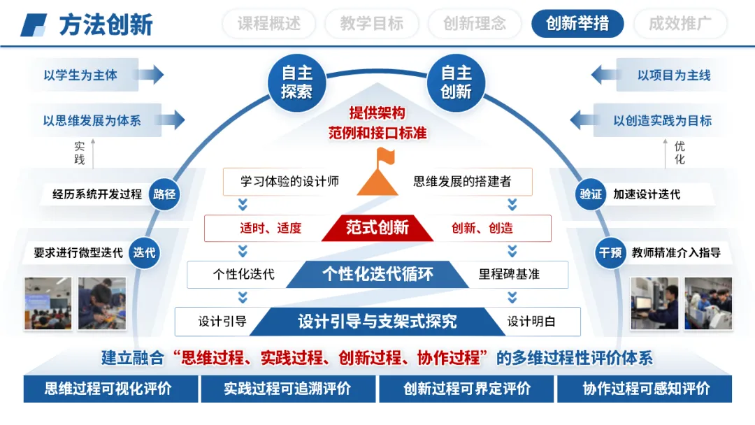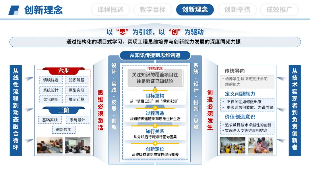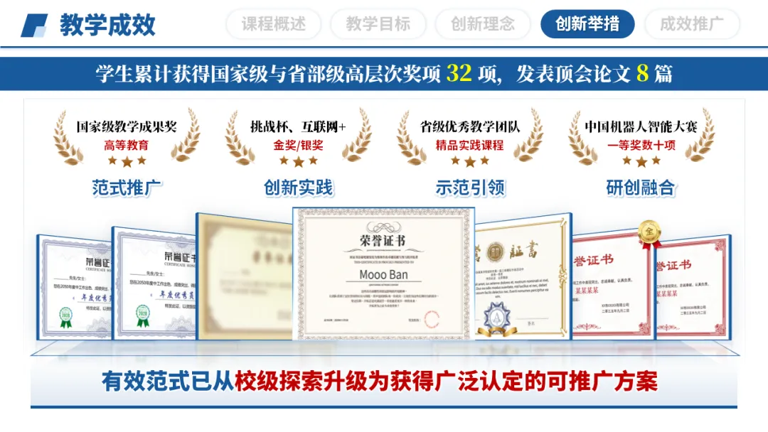 在核心内容呈现上,PPT 聚焦 “六步三阶・思创融合” 的创新模式,层层拆解基础实践、系统设计、创新应用三个阶段的具体任务,同时搭配 “资源可及、过程可控、指导有方、评价科学、文化包容” 的配套支撑体系,从研发环境开放时长、调试效率提升比例到项目按时完成率等量化数据,让抽象的教学理念转化为可感知、可评估的实践成果。成果展示部分更是亮点十足,集中呈现 32 项国家级与省部级奖项、8 篇顶会论文等硬核成绩,搭配荣誉证书图片增强视觉冲击,同时用数据清晰凸显教学创新的实际价值。